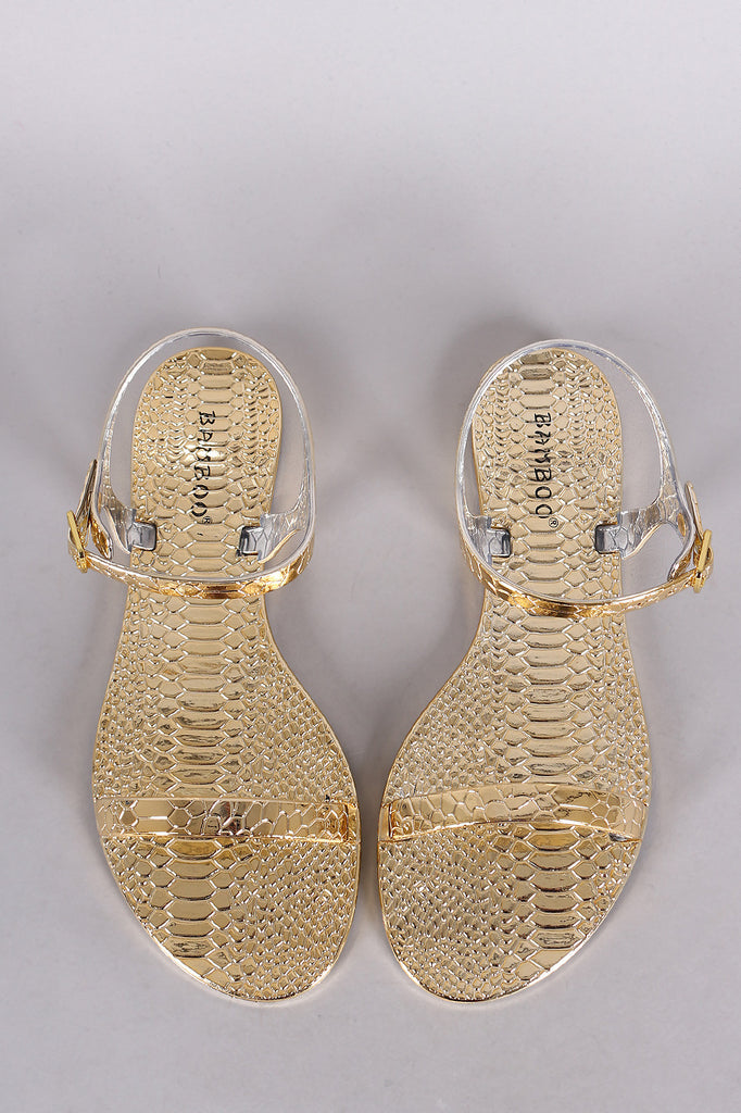 This fashionable  jelly  throughout, single strap across vamp, and adjustable ankle strap with buckle closure.