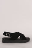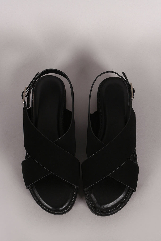 A chunky  flat sandal  featuring wide crossed straps, an open toe design, and a slingback strap with adjustable buckle closure. Sandal also features a glittery footbed trim, lug sole, and lightly padded insole.