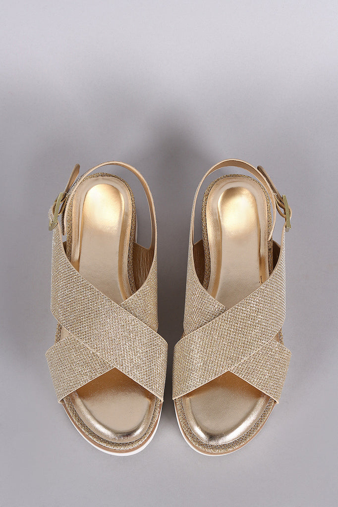 A glittery  flat sandal  featuring wide crossed straps, an open toe design, and a slingback strap with adjustable buckle closure. Sandal also features a chunky platform with lug sole and lightly padded insole.