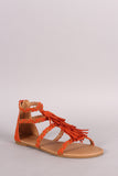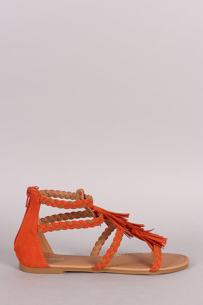 This chic  sandal  features an open toe silhouette, two-tone braided vamp straps adorned with tassels, lightly padded insole, and convenient back zip closure.