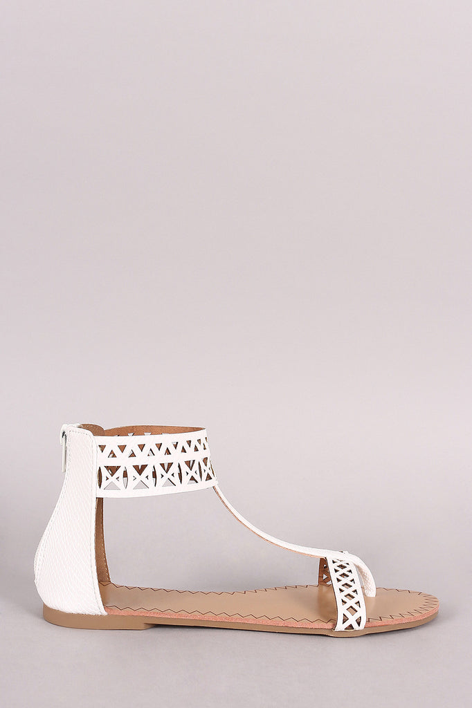 This chic sandal features a snake embossed vegan leather upper with perforated detail, t-strap construction, and convenient back-zip closure.