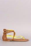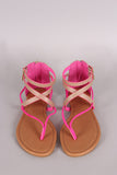This delightful flat sandal features a thong construction, two tone intertwined straps with two side buckles accent, lightly padded insole, and convenient back-zip closure.