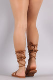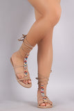 This trendy flat sandal features an open toe silhouette, chevron embellished beadwork design, lightly padded insole, and adjustable lace tie closure at the ankle.