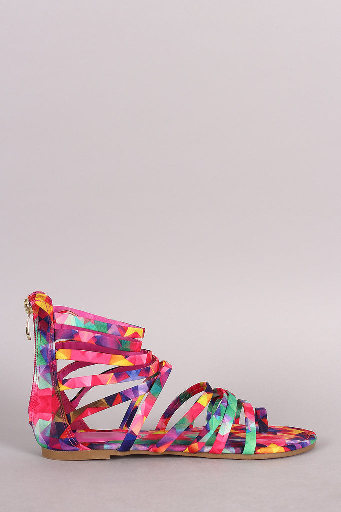 This flat sandal features a kaleidoscope print fabric, soft toe ring, strappy caged design vamp, lightly padded insole, and convenient back-zip closure.