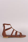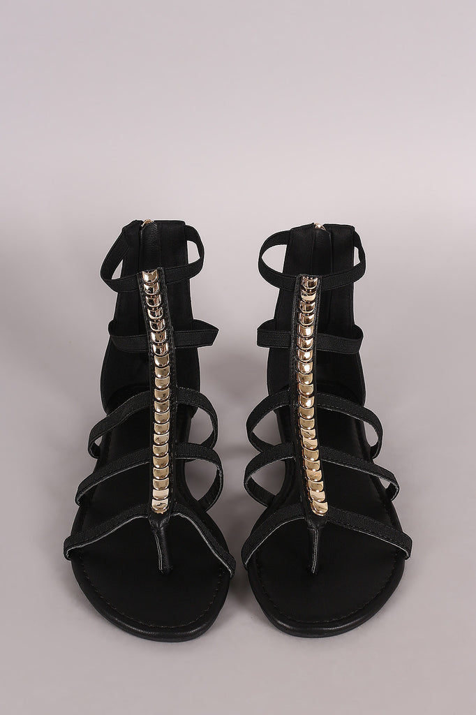 This edgy sandal features an elasticized straps design, center metallic ornament embellishment, lightly padded insole, and rear zipper closure for easy on/off.