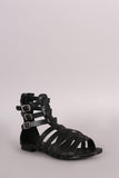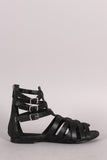 This flat sandal features an open toe silhouette, strappy construction with adjustable buckles accents, and low stacked heel. Finished with lightly padded insole and convenient back zip closure.