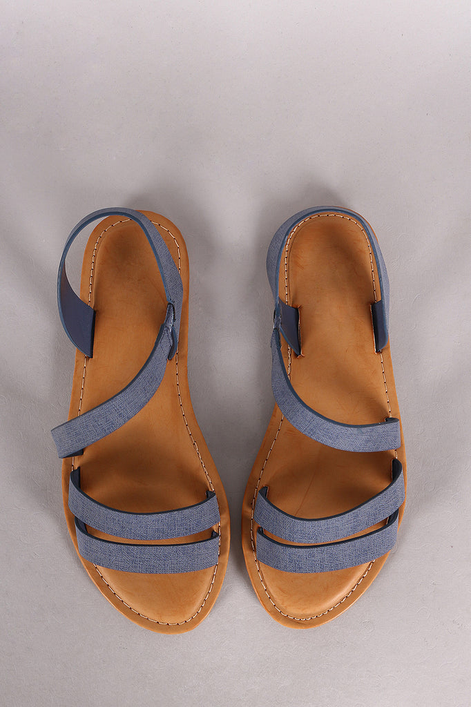 This summery  flat sandal  features a denim print nubuck upper, open toe silhouette with asymmetrical strappy construction, and lightly padded insole for comfort.