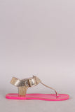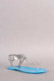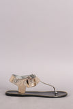 This flat sandal features a t-strap construction, metallic snake embossed design upper, metallic trim along the edge, and adjustable ankle strap with buckle closure.