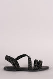 This casual-chic sandal features an asymmetrical straps adorned with polished dome studs, open toe silhouette, lightly padded insole, and easy slip-on construction.