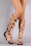 This neon watercolor print fabric, strappy caged design shaft with contrast piping detail, open toe silhouette, lightly padded insole, and rear zipper closure for easy on/off.