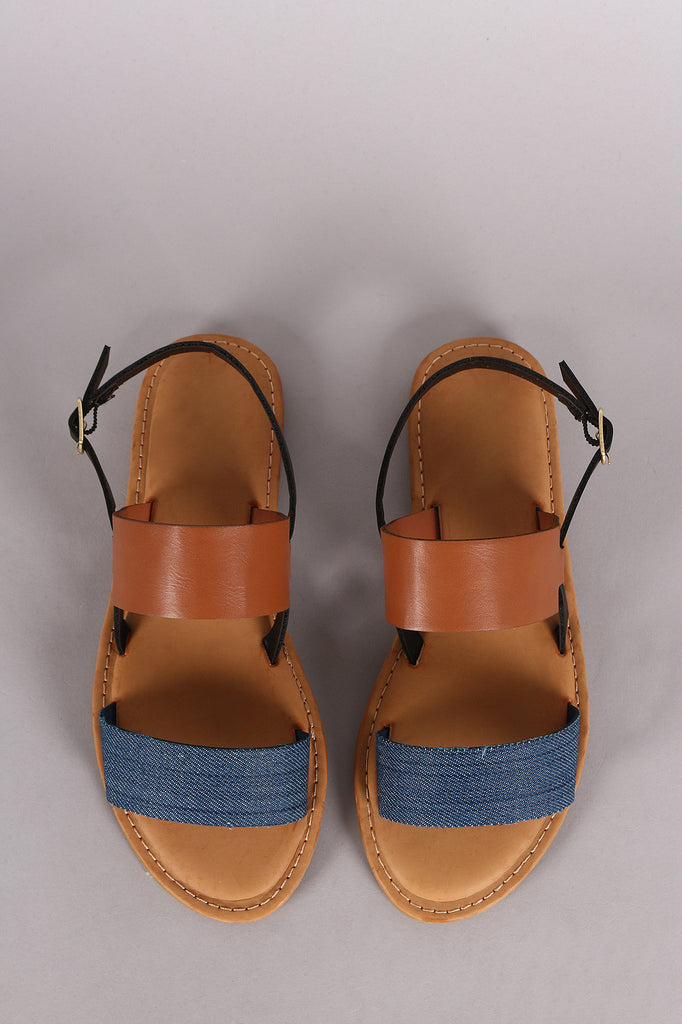 This trendy flat sandal features two tone color, double band across vamp with one denim upper, open toe silhouette, and slingback with adjustable buckle closure. Finished with a lightly padded insole.