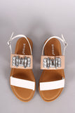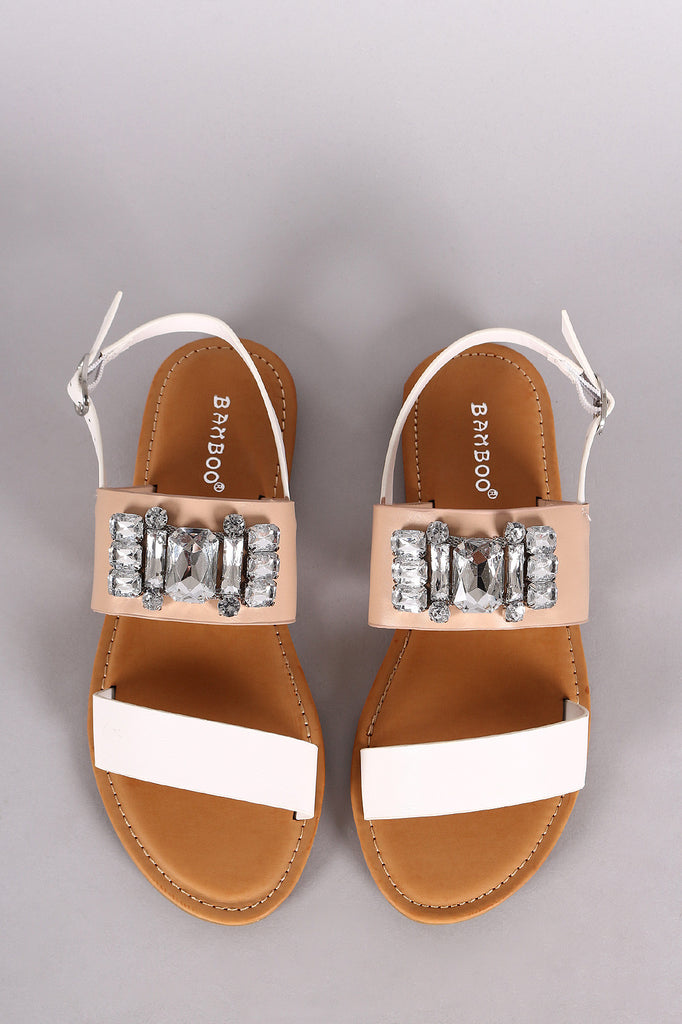 This flat sandal features double band across vamp, open toe silhouette, rhinestones design, and slingback construction with side buckle closure. Finished with a lightly padded insole for comfort.