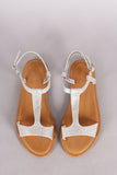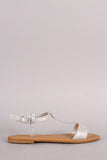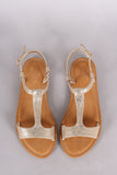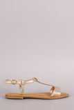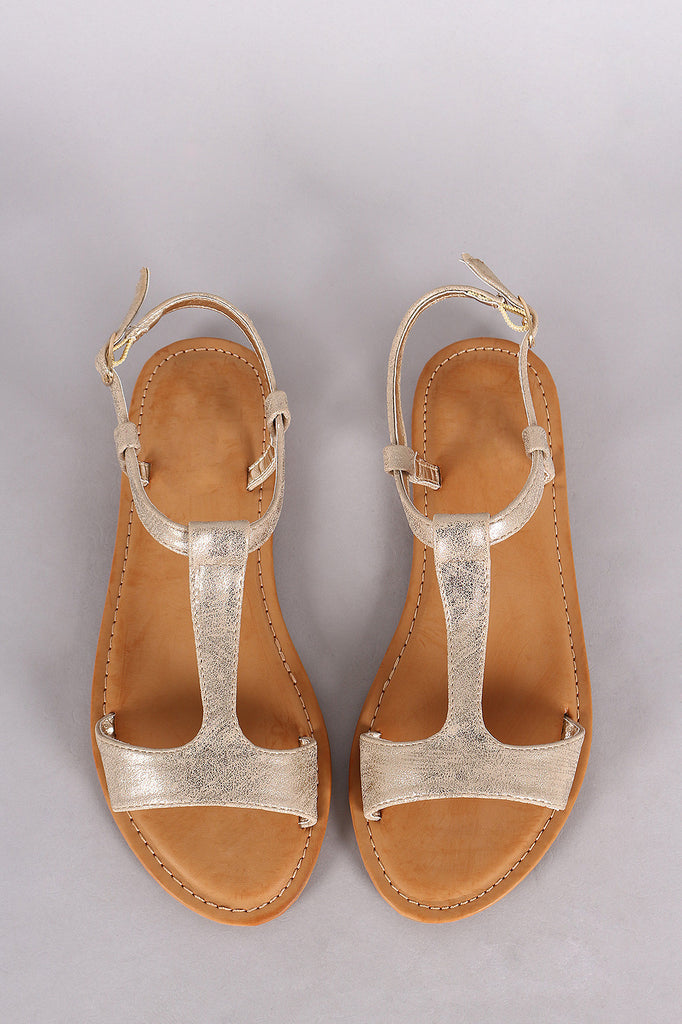 This open toe  flat sandal  features a T-strap construction, lightly padded insole, and adjustable ankle strap with buckle fastening.