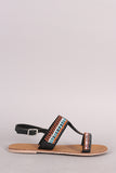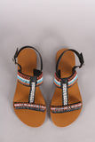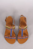 This open toe flat sandal features a T-strap construction, colorful beads embellishment, braided leather detail, and ankle strap with side buckle closure.