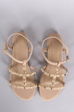 This flat sandal features a nubuck upper, three straps across vamp, t-strap construction with studs design, and slingback with side buckle closure. Finished with a lightly padded insole.