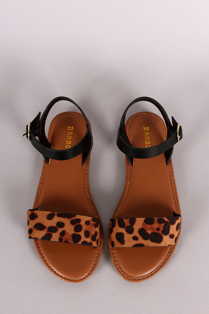 This  flat sandal  features one band leopard print across vamp, and an ankle strap with an adjustable side buckle. Finished with a lightly padded insole.