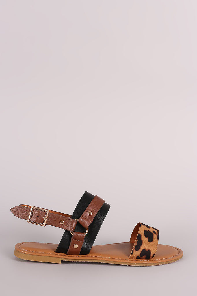 This lightweight  flat sandal  features an open toe silhouette, double band across vamp, decorative studded hardness straps design, and adjustable slingback strap with buckle closure. Finished with lightly padded insole for comfort.