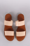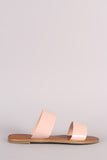 This casual flat sandal features double wide bands across vamp made of patent, and easy slip-on construction. Finished with a lightly padded insole for comfort.