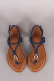 This thong flat sandal features a T-strap construction, metallic tear drop ornament, braided denim straps, lightly padded insole, and adjustable ankle strap with buckle fastening.