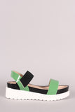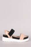 This sandal features an open toe silhouette, two tone design, lightly cushioned insole, and elasticized ankle strap for an adjustable fit.