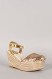 Give your feet a treat with this cute platform wedge! Featuring round toe with sparkling glitter accent, espadrille platform, and wedge heel. Finished with lightly padded insole and adjustable ankle strap with buckle closure.