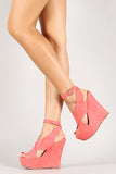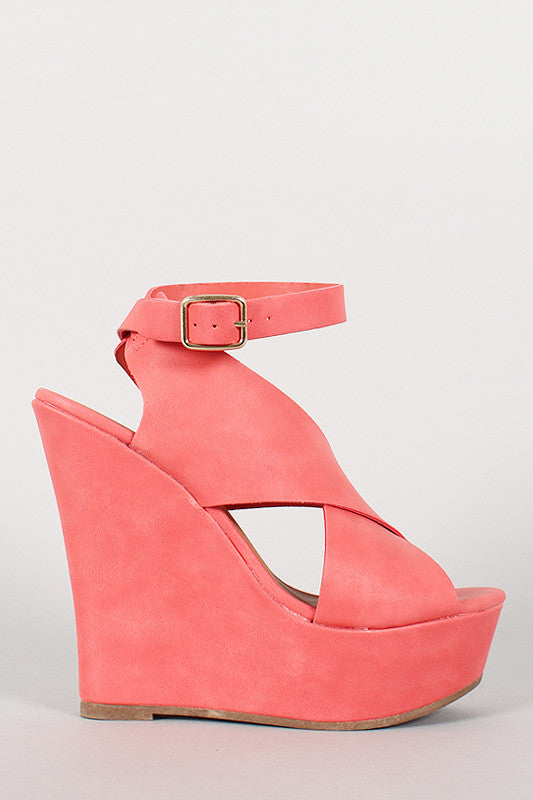 Featuring leatherette upper, wide cross straps, open toe design, strappy slingback style and platform wedge heel. Finished with lightly padded insole and adjustable ankle buckle.