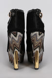 This gorgeous peep toe wedge features a perforated cuff with patent trim, decorative buckle accents, woven multicolor glitter fabric covered platform, and metallic accent wedge heel. Finished with cushioned insole and rear zipper closure for easy on/off.