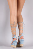 This platform denim upper, braided jute rope trim platform, and wedge heel. Finished with lightly padded insole and wrapped around self-tie lace up closure.