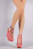 These peep toe toe wedges are on a leg-lengthening platform wedge, featuring a honeycomb cutout vamp with a rear back adjustable strap.