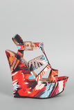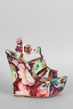 This alluring floral print satin upper, strappy caged design vamp, stitching accents, and wrapped platform wedge heel. Finished with lightly padded insole and adjustable ankle strap with buckle fastening.