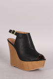 These wedges feature a peep toe silhouette, center seam detail, back cutout design with buckle strap closure, faux wooden platform, and wedge heel. Finished with lightly padded insole for comfort.