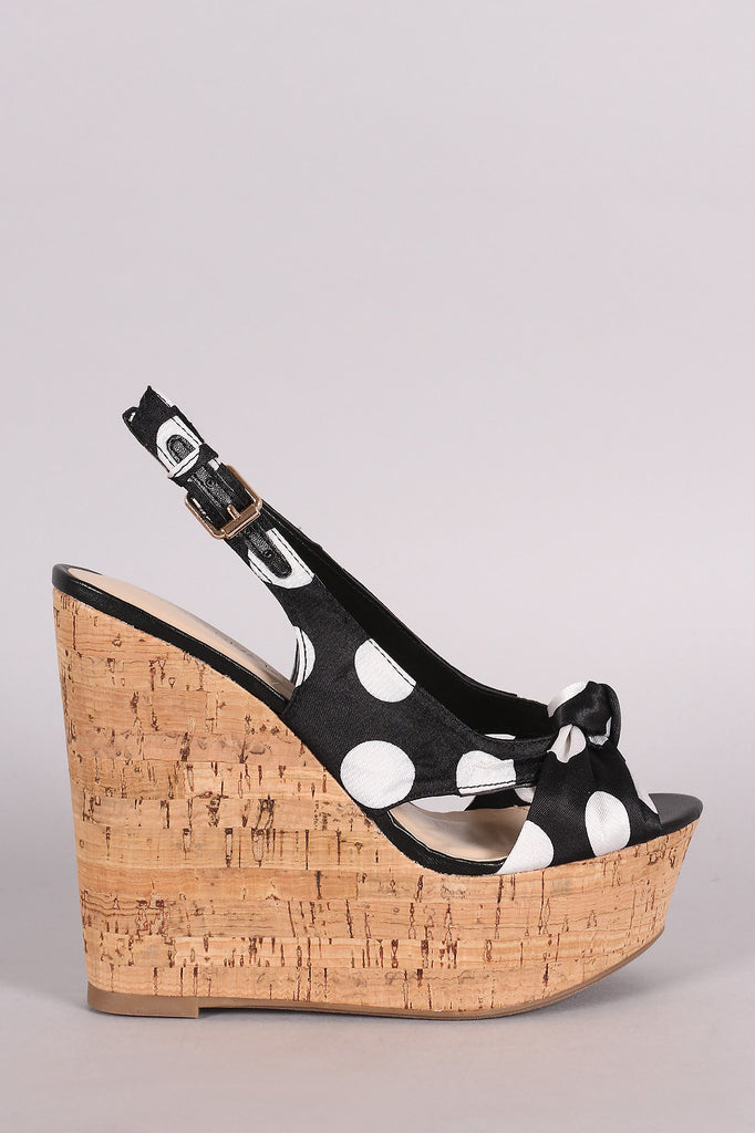 This glamorous peep toe polka dot print satin upper with a knotted detail at front vamp, cork platform, and wedge heel. Finished with lightly padded insole and adjustable slingback strap with buckle fastening.