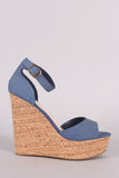 This stylish wedge features a denim/nubuck upper, one band across vamp, peep toe silhouette, and cork platform wedge heel. Finished with a lightly padded insole and ankle strap with side buckle closure.