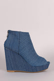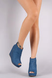 These booties feature a denim upper, peep toe silhouette, hidden wedge heel, and rear zip-up closure. Finished with a lightly padded insole for comfort.