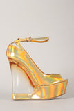 These amazingly hot wedges feature an open toe silhouette, back cutout details, wrapped platform, and lucite wedge heel. Finished with lightly padded insole and adjustable ankle strap with buckle closure.