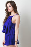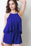 This romper is trapeze silhouette, featuring a flowy top tier. Pull on style. Lined. Designed with spaghetti straps and plugging back. Elasticized waist. Accessories sold separately. Made in U.S.A. 100% Polyester.