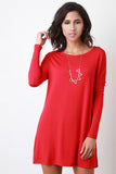 This jersey knit dress features a round neckline, long sleeves, boxy cut fit, and mini hemline. Accessories sold separately. Made in U.S.A. 95% Rayon, 5% Spandex.