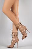 This fashionable heel features a caged cutout design vamp, peep toe silhouette, corset-style lace up detail, and stiletto heel. Finished with lightly padded insole and rear zipper closure for easy on/off.