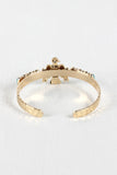 An open-ended bracelet featuring a hammered metallic band, a rising eagle motif at the front, and oval faux turquoise stones. Nickel, lead, and cadmium compliant.