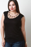 This plus size top features a round neckline, leopard print caged design at front, sleeveless construction, and straight hemline. Accessories sold separately. Made in U.S.A. 97% Rayon, 3% Spandex.