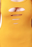 This jersey knit jumpsuit features a scoop neckline, sleeveless design, sculpture fit, slit keyholes at front, and thighs. Accessories sold separately. Made in U.S.A. 94% Cotton, 26% Spandex.