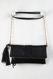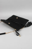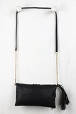 This fun crossbody bag features a pebbled vegan leather with woven accent, flap design with magnet closure, a zippered main compartment, and vegan leather fringe tassel accent at side. The interior has a fabric lining, one zipper pocket, and two slip pockets. Shoulder strap is crossbody vegan leather strap with chain detail and attaches to two O-rings at the side of the bag with glossy metallic lobster hooks. Crossbody strap has 25.75" Drop.