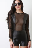This long sleeve romper features a round neckline, vegan leather with contrasting fishnet trim, long sleeves design, and back zipper closure. Accessories sold separately. Made in U.S.A. 95% Polyester, 5% Spandex.
