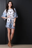 This dress features a round neckline, short sleeves, shift cut fit, scoop back with a self-tie bow at nape, and bohemian pattern print design. Accessories sold separately. 100% Polyester.