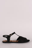 A huarache-style flat sandal featuring a woven front, open toe, and t-strap design with ankle strap and adjustable buckle closure. Finished with lightly padded insole.