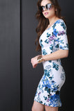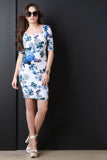 This bodycon dress features textured stretch knit, floral print, u-neckline, quarter length sleeves, and hidden back zipper closure. Accessories sold separately. Made in U.S.A. 96% Polyester, 4% Spandex.
