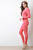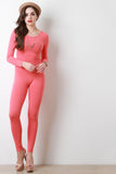 A bodycon jersey jumpsuit featuring a round neckline, scooped backline, and long sleeves and tapered legs. Accessories sold separately. Made in U.S.A. 95% Cotton, 5% Spandex.