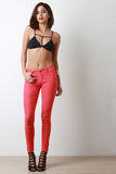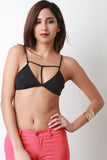This bralette top features a triangle top design, T-caged yoke, spaghetti shoulder straps, and a crisscross strappy back. Accessories sold separately. Made in U.S.A. 96% Polyester, 4% Spandex.