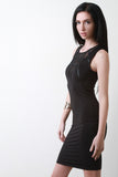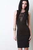 This sleeveless midi dress features smooth stretch fabric, a round neckline, and semi-sheer mesh with stripe design on middle front. Accessories sold separately. 94% Polyester, 6% Spandex.