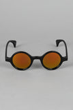 These sunglasses feature horn rim style frame, round mirrored lenses, and single nose bridge.